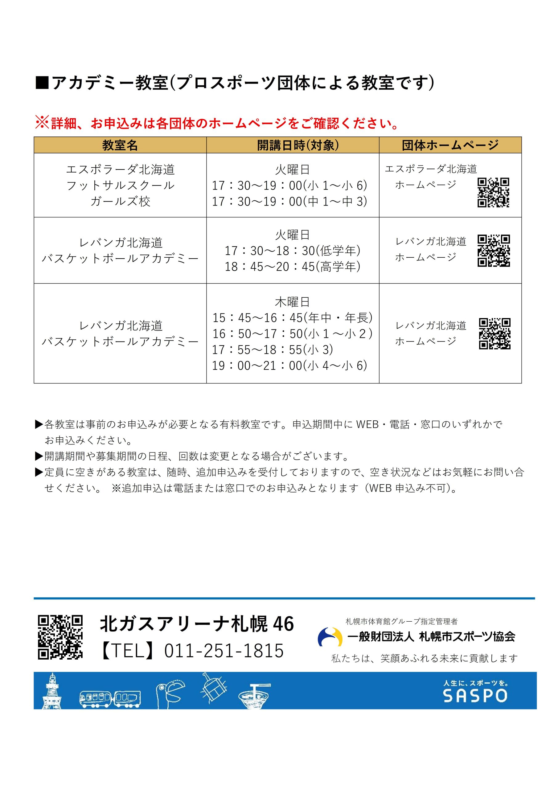 館内にて配布いたしますので、教室内容などの詳細につきましては、