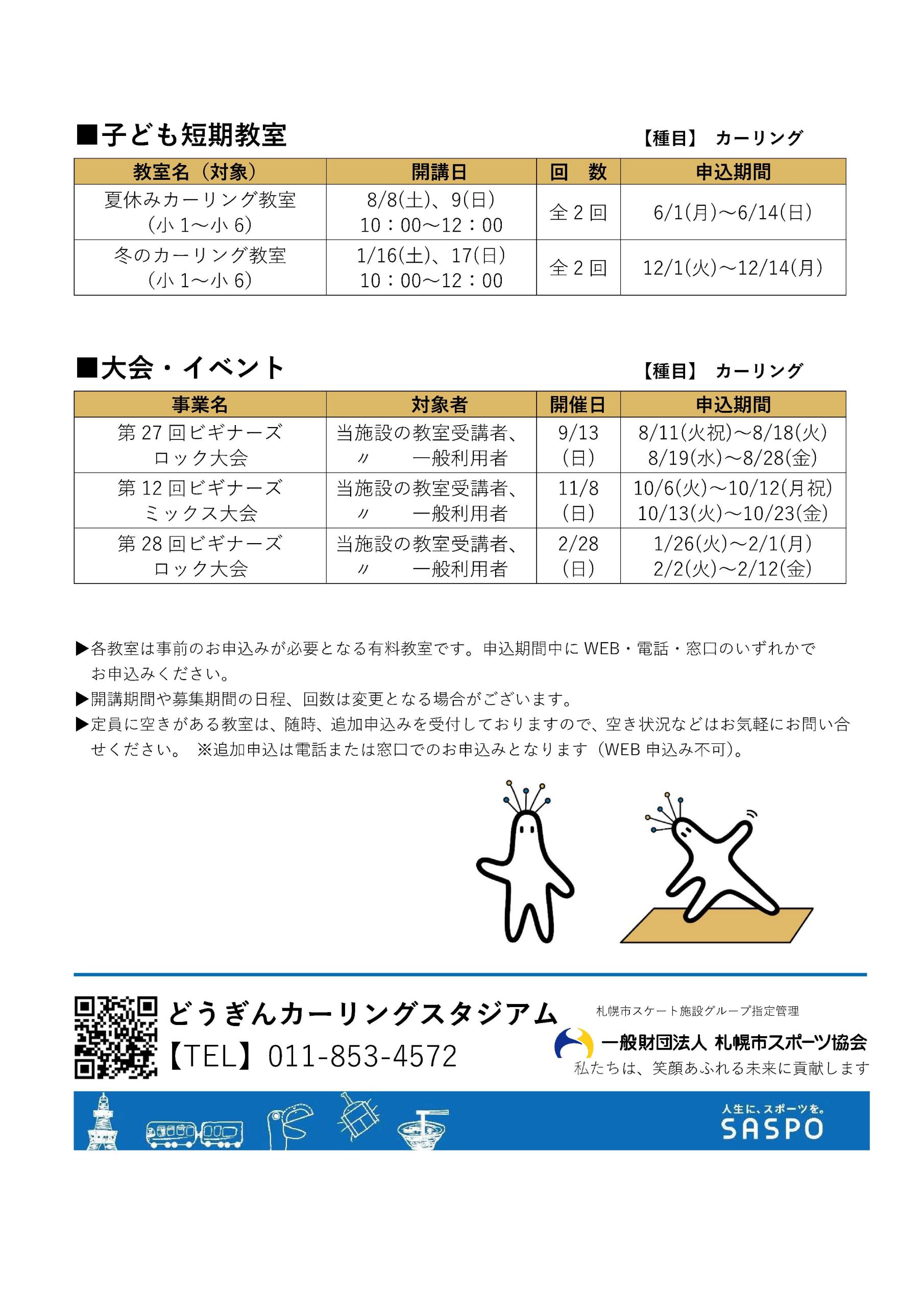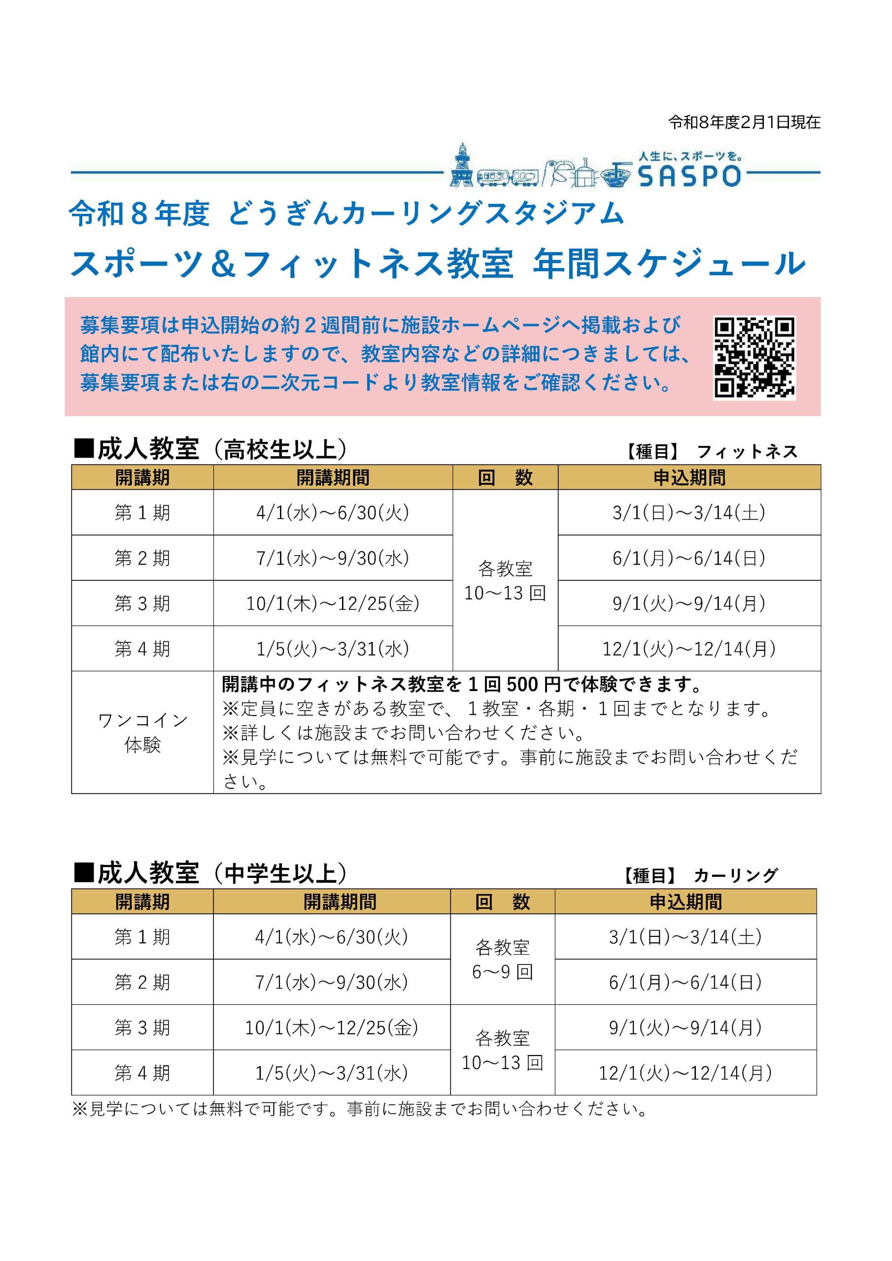 トピックス 令和8年度 スポーツ&フィットネス教室年間スケジュール表更新日:2026年2月1日各期の募集要項は申込開始の約2週間前に施設ホームページへ掲載および館内にて配布いたしますので、教室内容などの詳細につきましては、募集要項または下記リンクの教室情報をご確認ください。▶「どうぎんカーリングスタジアム教室情報」令和8年度 スポーツ&フィットネス教室年間スケジュール表(PDF)▶︎ トピックス一覧に戻る