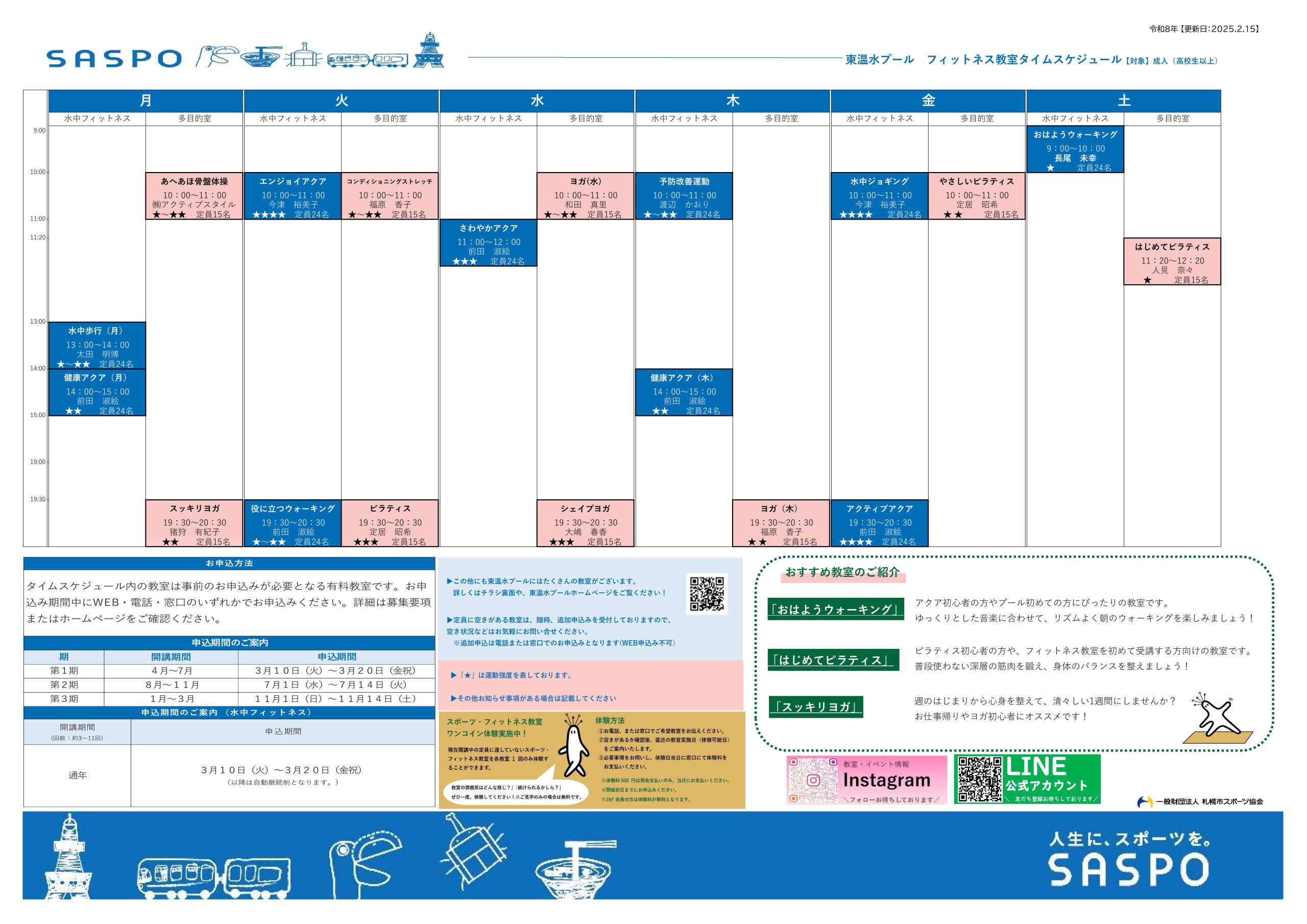 トピックス 令和8年度 東温水プールフィットネス教室タイムスケジュール表更新日:2026年2月1日令和8年度東温水プールフィットネス教室のタイムスケジュールをご紹介します!教室内容などの詳細につきましては、下記の教室情報をご確認ください。 教室情報|東温水プール(sapporo-sport.jp)令和8年度 フィットネス教室タイムスケジュール表▶︎ トピックス一覧に戻る