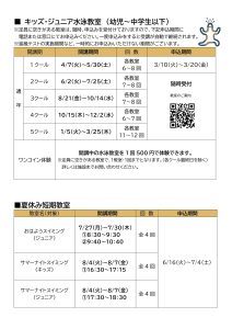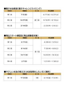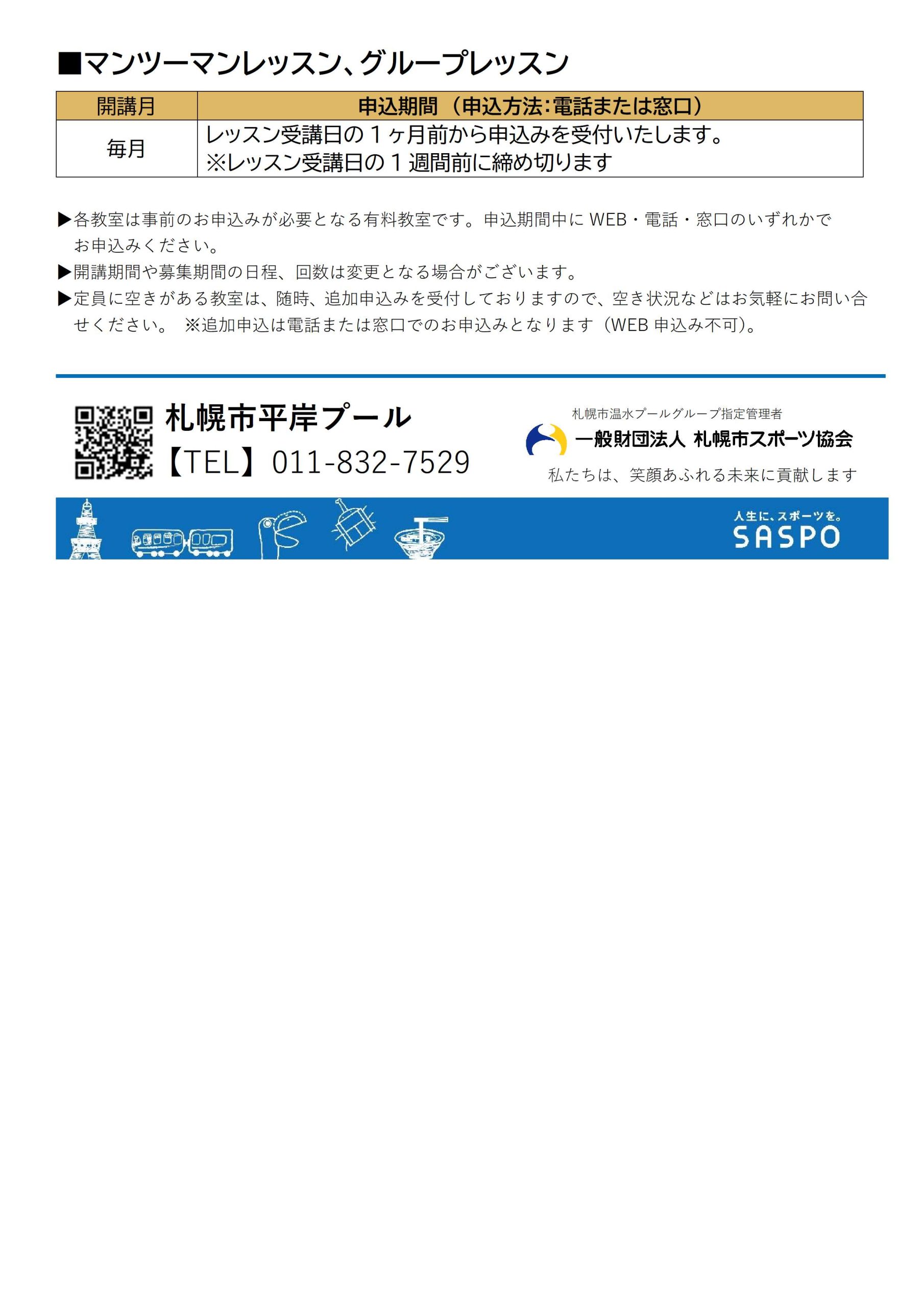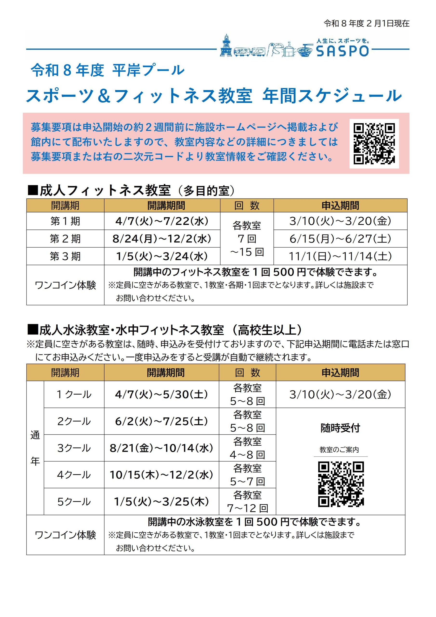 トピックス 令和8年度 平岸プール スポーツ&フィットネス教室年間スケジュール表更新日:2026年2月17日各期の募集要項は申込開始の約2週間前に施設ホームページへ掲載および館内にて配布いたしますので、教室内容などの詳細につきましては、教室情報をご確認ください。▶︎ トピックス一覧に戻る