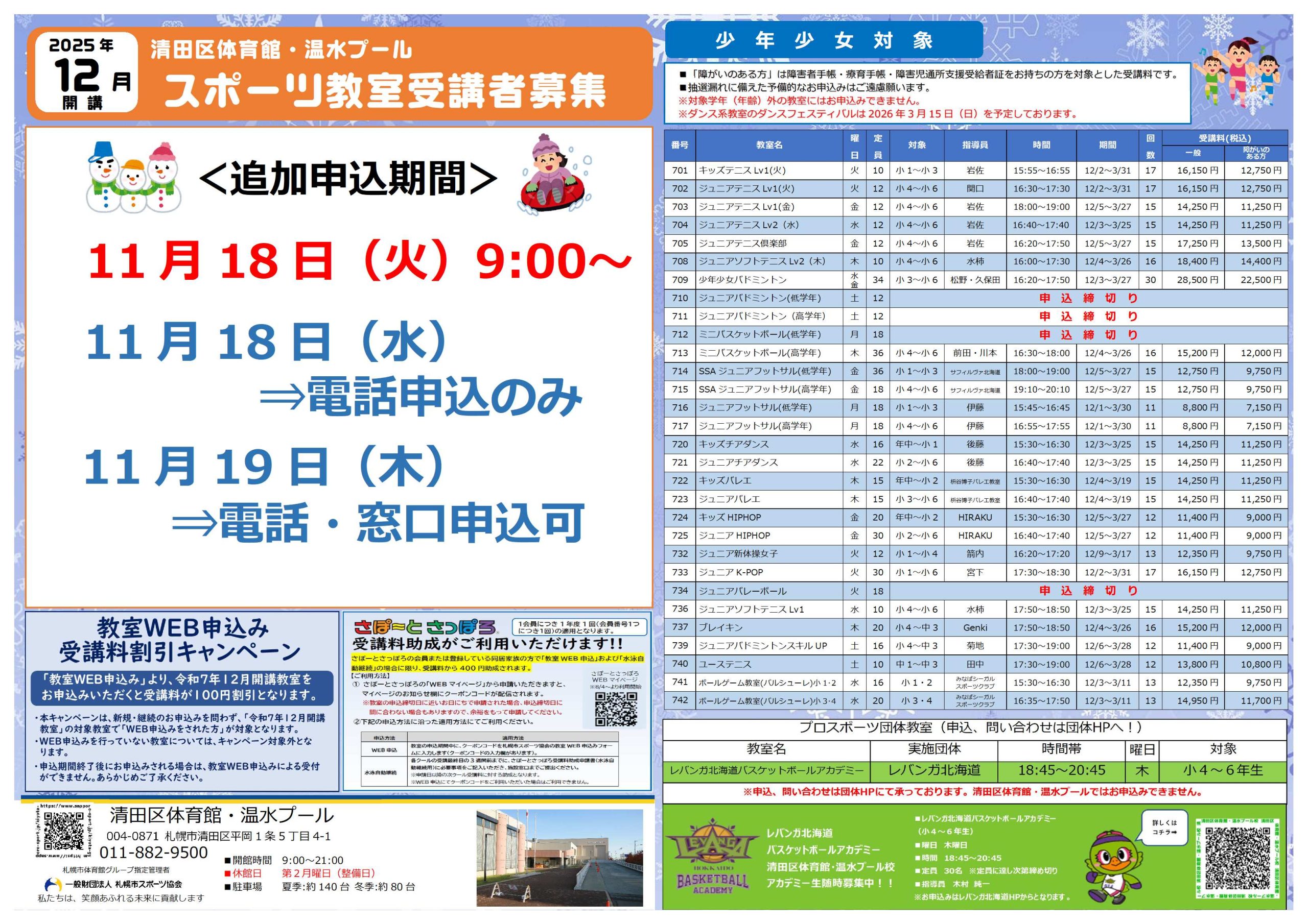 ※定員に空きがある教室のみ、先着順にて追加申込を受付いたします。