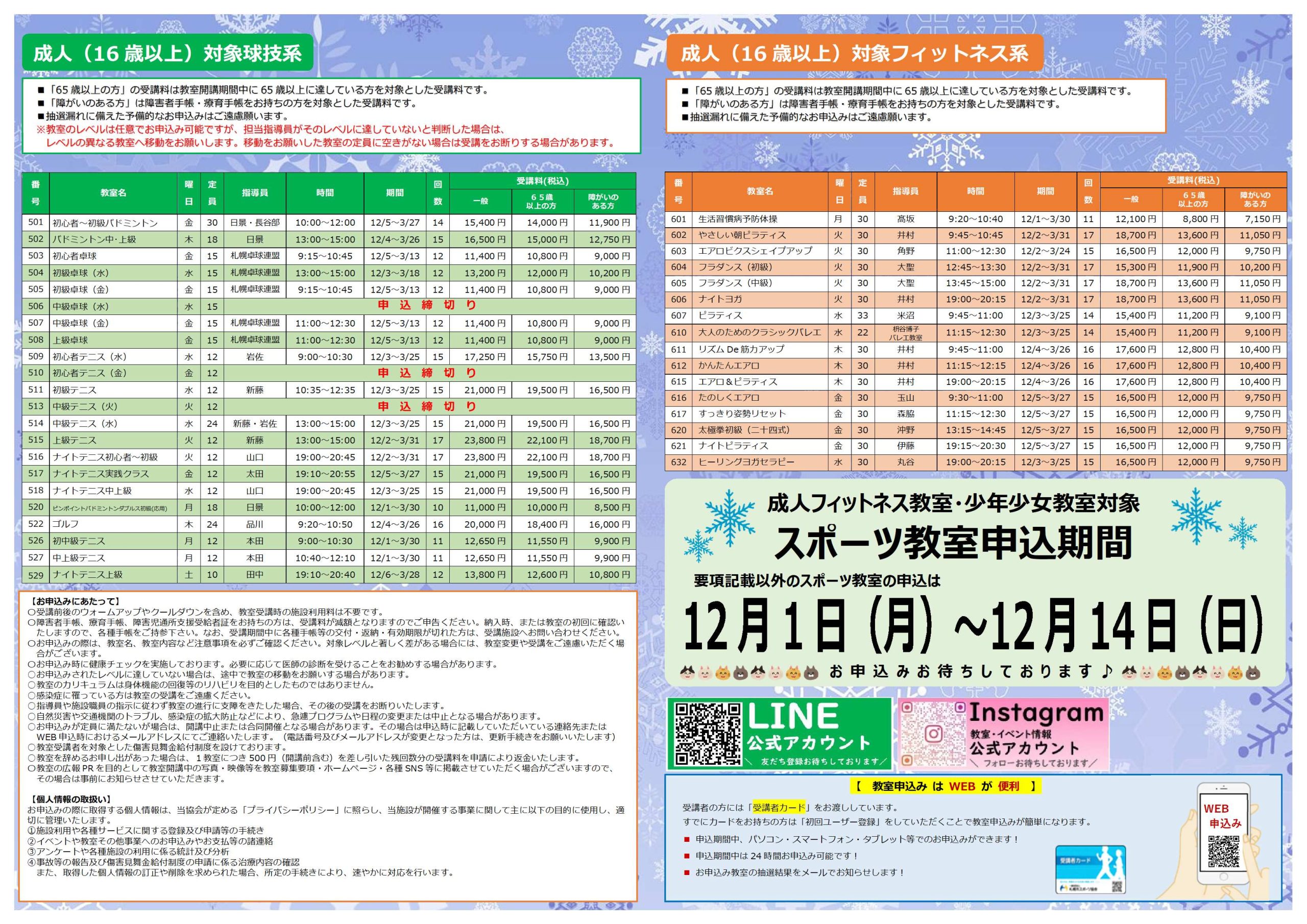 ※申込み締め切り教室は、補欠待ちでのご案内となります。