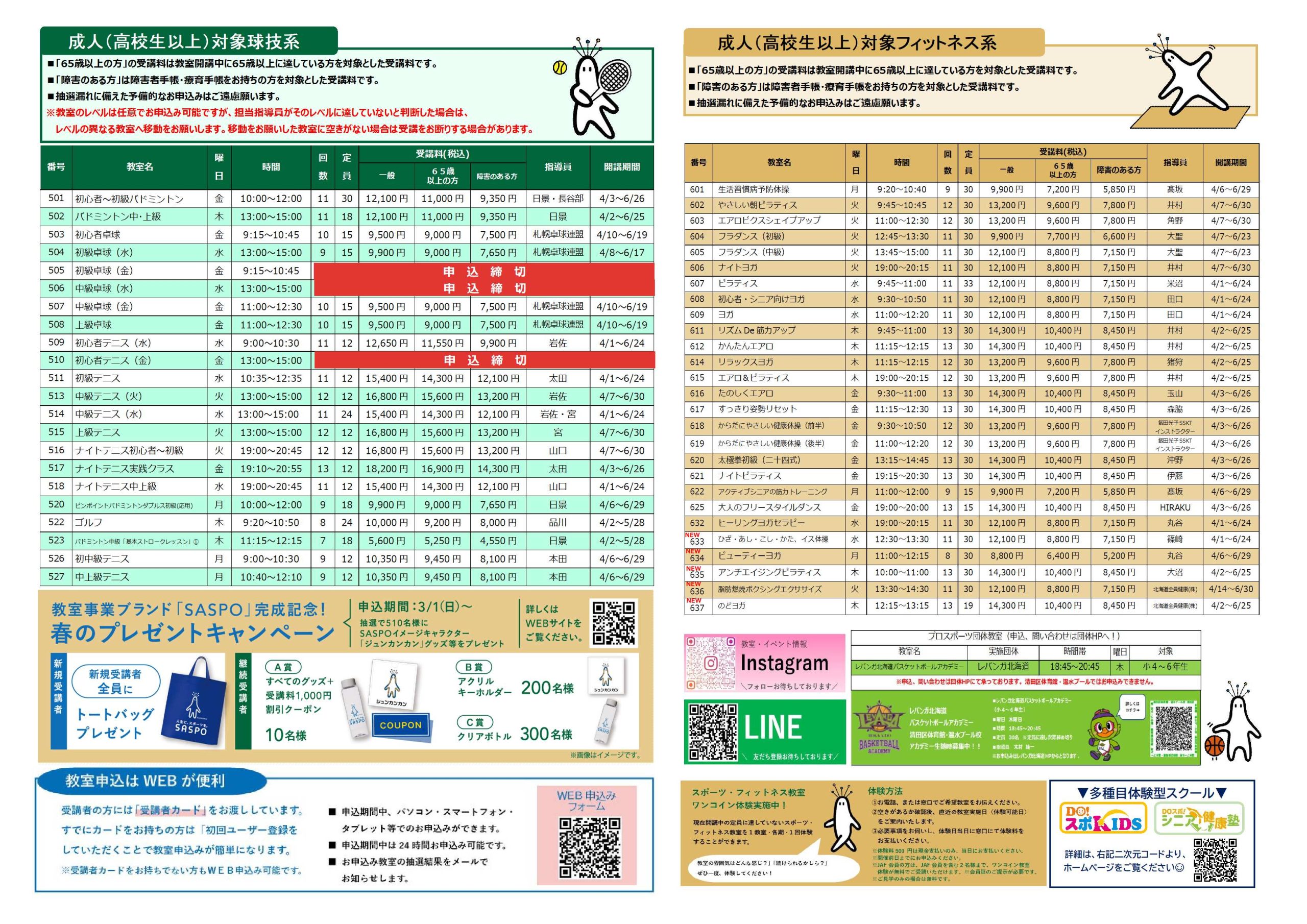 ※申込み締め切り教室は、補欠待ちでのご案内となります。