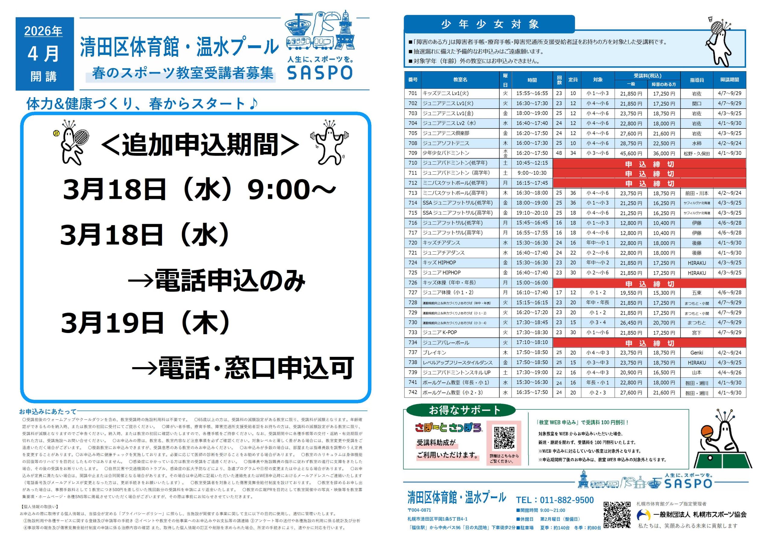 ※定員に空きがある教室のみ、先着順にて追加申込を受付いたします。