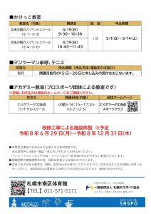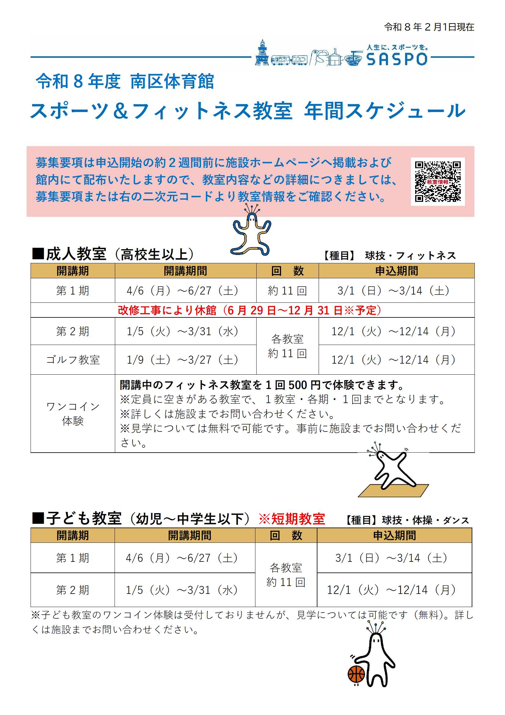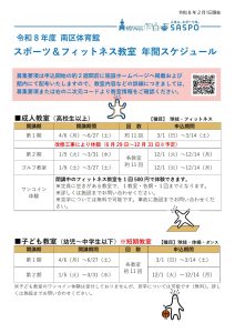 トピックス 令和8年度 スポーツ&フィットネス教室年間スケジュール表更新日:2026年2月14日各期の募集要項は申込開始の約2週間前に施設ホームページへ掲載及び館内にて配布いたします。教室内容の詳細につきましては教室情報をご確認ください。PDFファイル▶︎ トピックス一覧に戻る