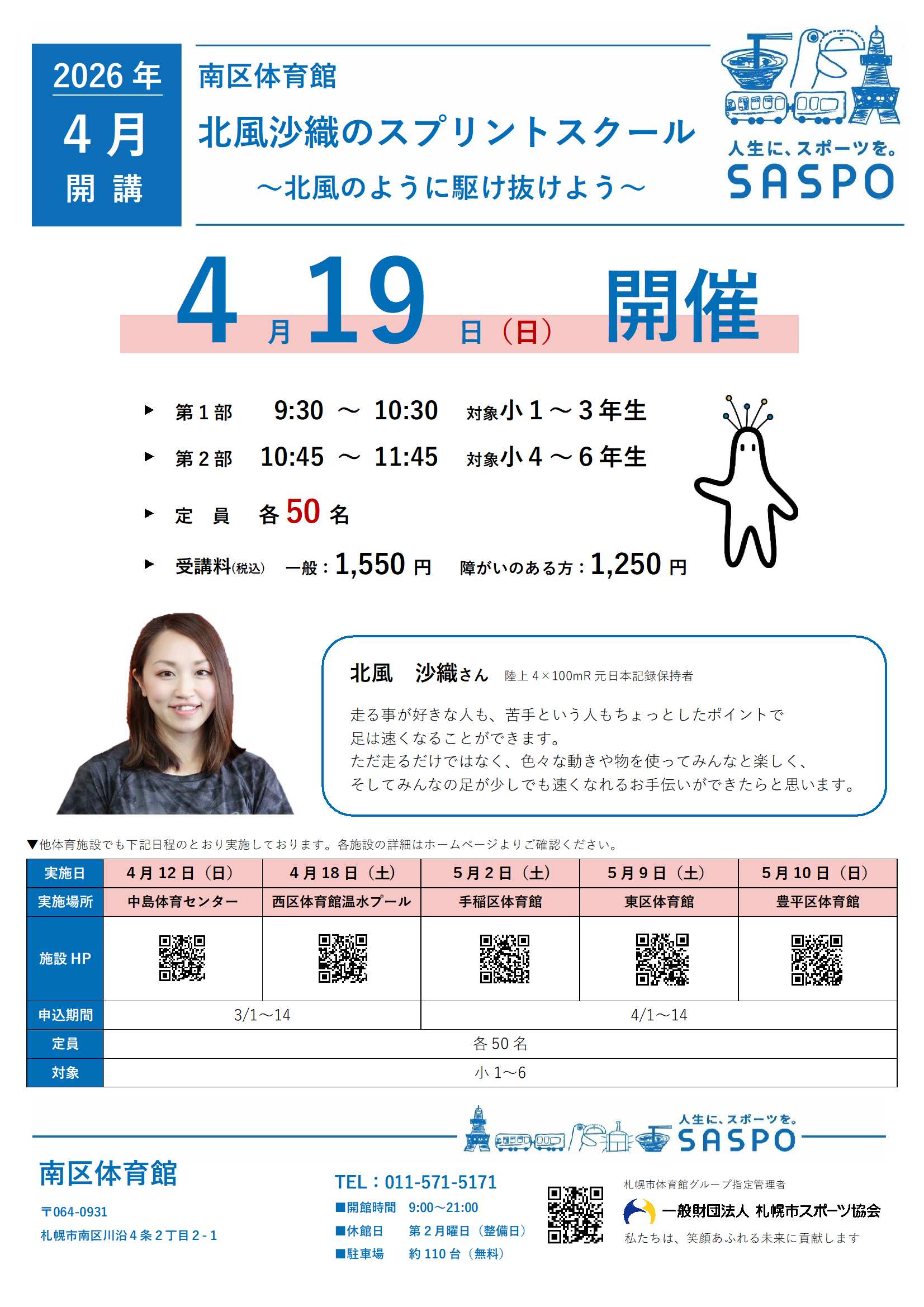 令和8年4月19日(日)開催 北風沙織のスプリントスクールのご案内!!(18日より追加申込み!)
