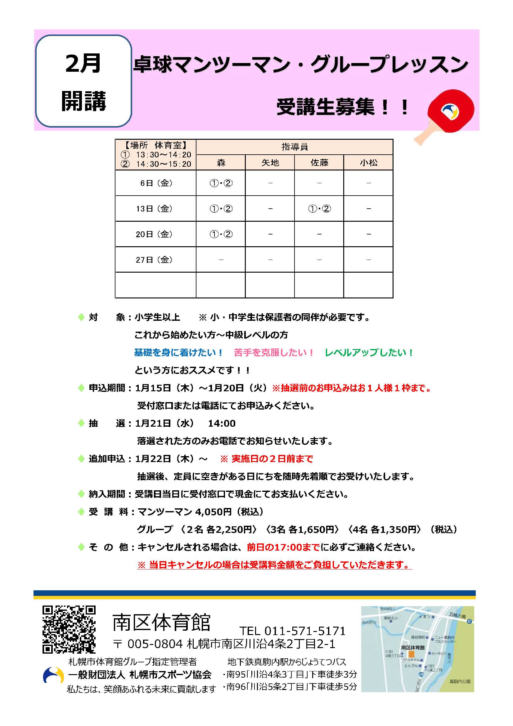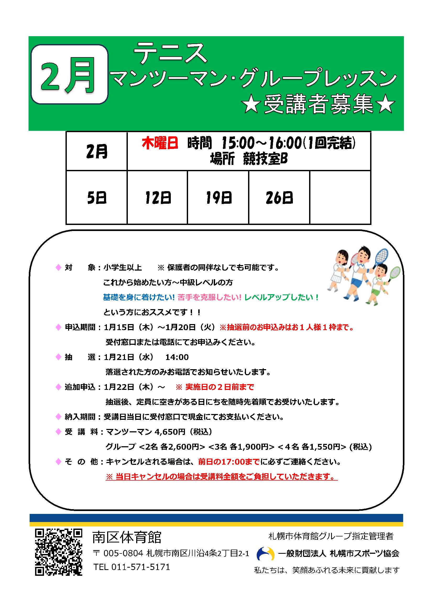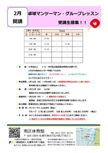 トピックス 2月 【卓球】【テニス】マンツーマン・グループレッスンのご案内更新日:2026年1月13日2月【卓球】【テニス 】マンツーマン・グループレッスンの日程は下記の通りとなります。 皆さまのお申込みをお待ちしております。【お申込み・お問合せ】南区体育館 011-571-5171▶︎ トピックス一覧に戻る