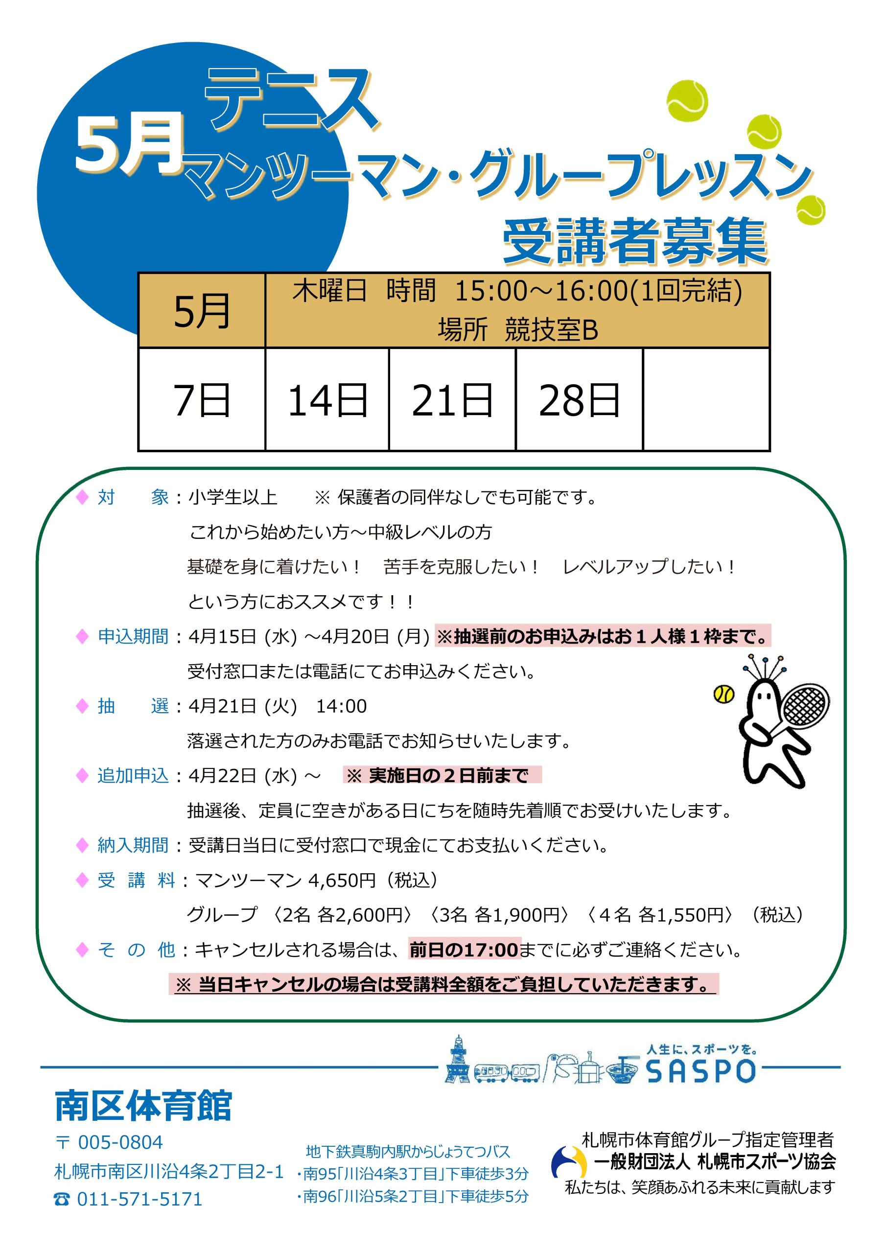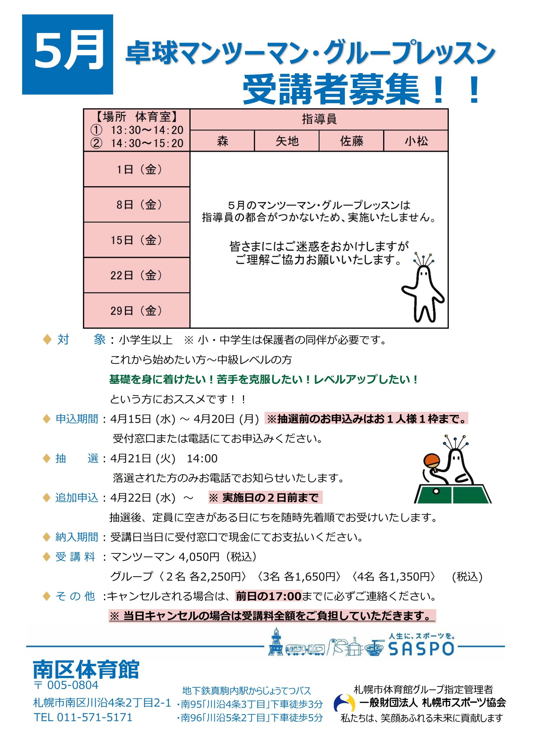 トピックス 5月 【卓球】【テニス】マンツーマン・グループレッスンのご案内更新日:2026年4月11日5月【卓球】【テニス 】マンツーマン・グループレッスンの日程は下記の通りとなります。 皆さまのお申込みをお待ちしております。【お申込み・お問合せ】南区体育館 011-571-5171▶︎ トピックス一覧に戻る