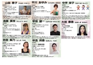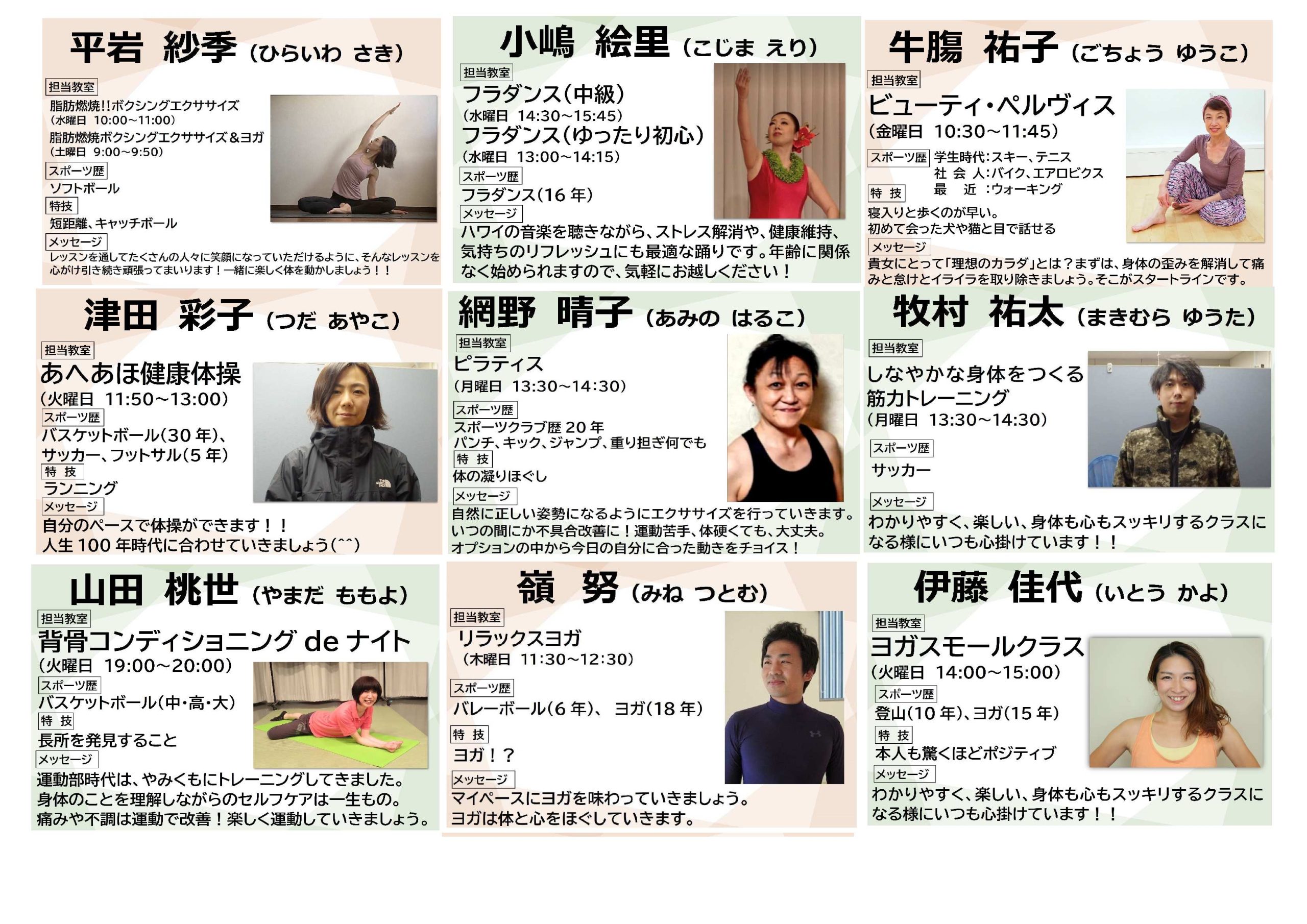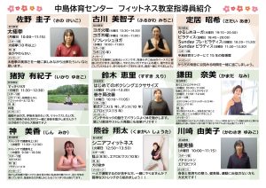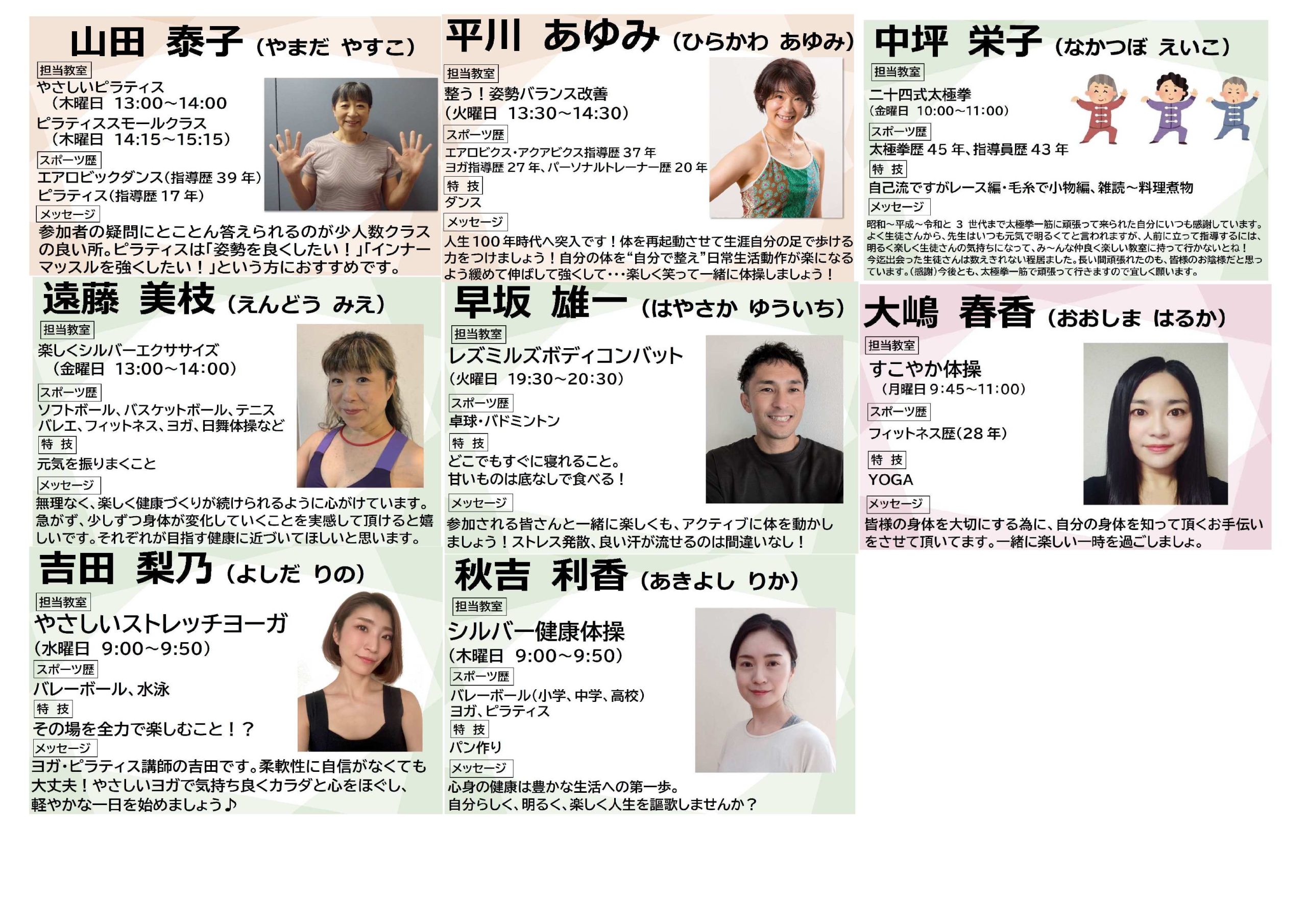 トピックス 令和7年度 教室・指導員紹介更新日:2025年2月1日教室の指導員をご紹介いたします!教室内容などの詳細につきましては、教室情報をご確認ください。▸【中島体育センター教室情報リンク】 教室・指導員紹介(PDF)▶︎ トピックス一覧に戻る