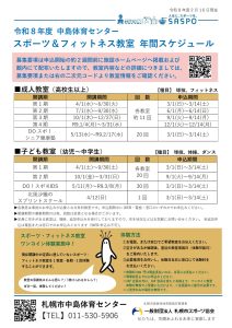 トピックス 令和8年度 スポーツ&フィットネス教室年間スケジュール表更新日:2026年2月15日各期の募集要項は申込開始の約2週間前に施設ホームページへ掲載および館内にて配布いたします!教室内容などの詳細につきましては、教室情報をご確認ください。 令和8年度 スポーツ&フィットネス教室年間スケジュール表(PDF)▶︎ トピックス一覧に戻る