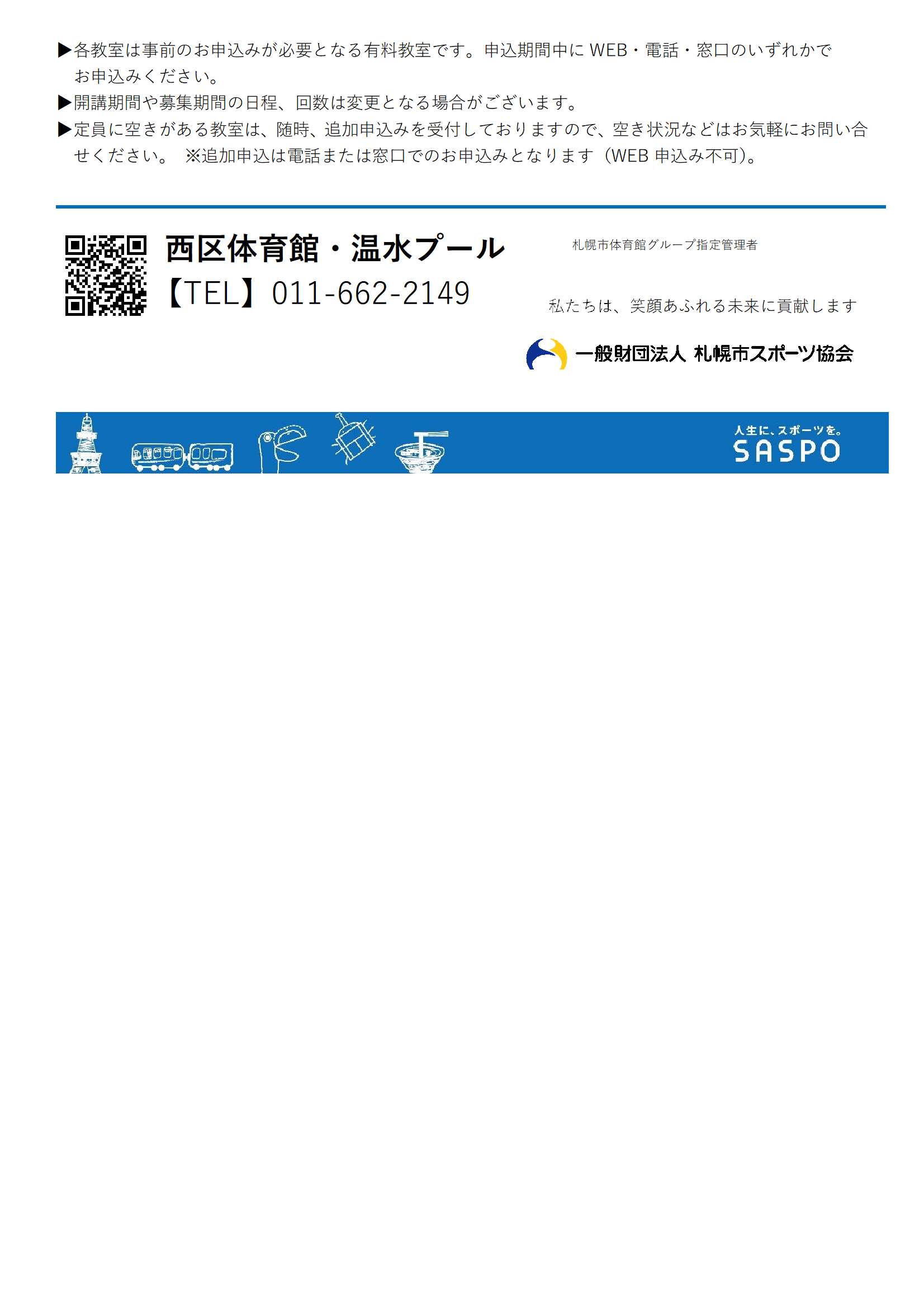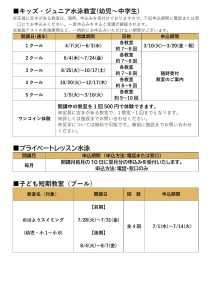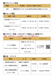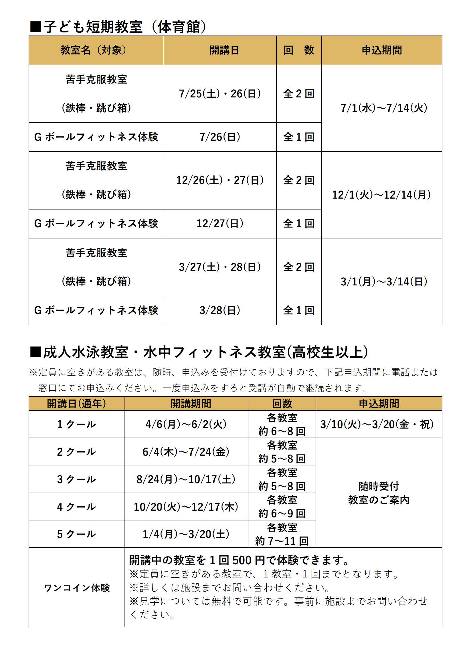 トピックス 令和8年度 スポーツ&フィットネス教室年間スケジュール表更新日:2026年2月1日 各期の募集要項は申込期間開始の約2週間前に施設ホームページへ掲載および館内にて配布いたしますので、教室内容などの詳細につきましては、教室情報をご確認ください。▶︎ トピックス一覧に戻る