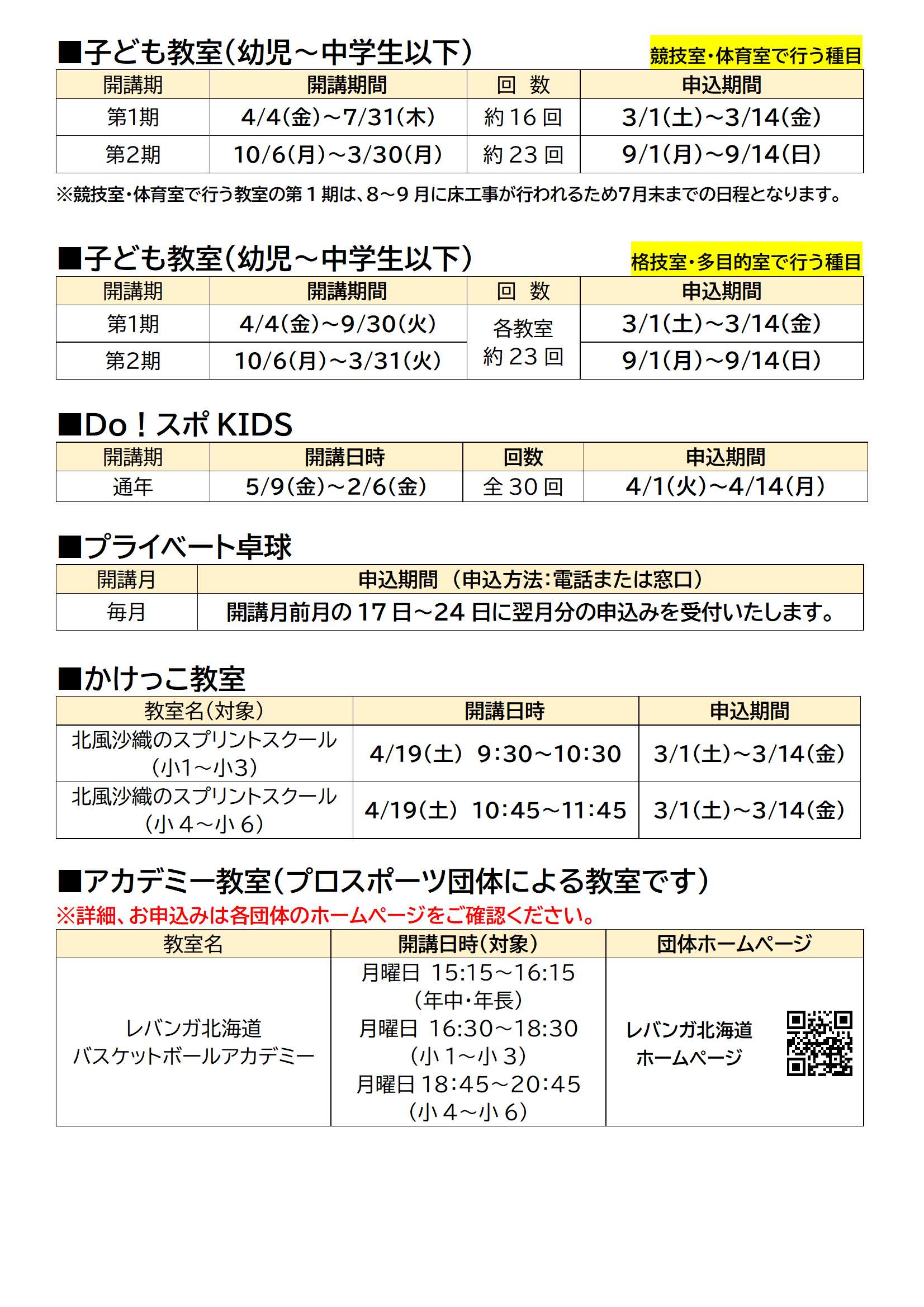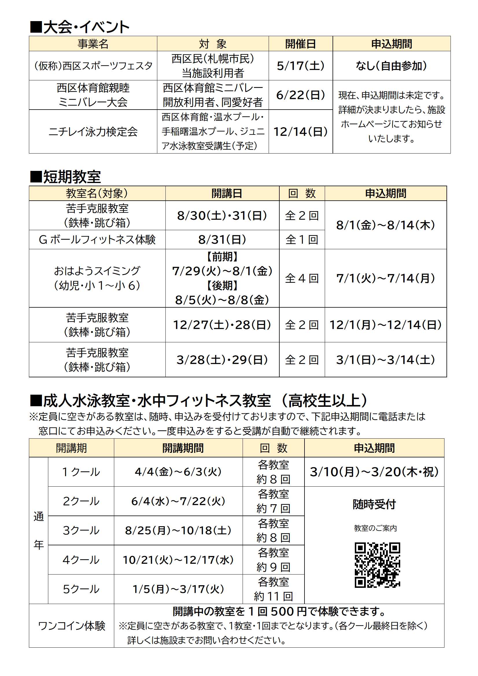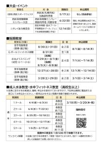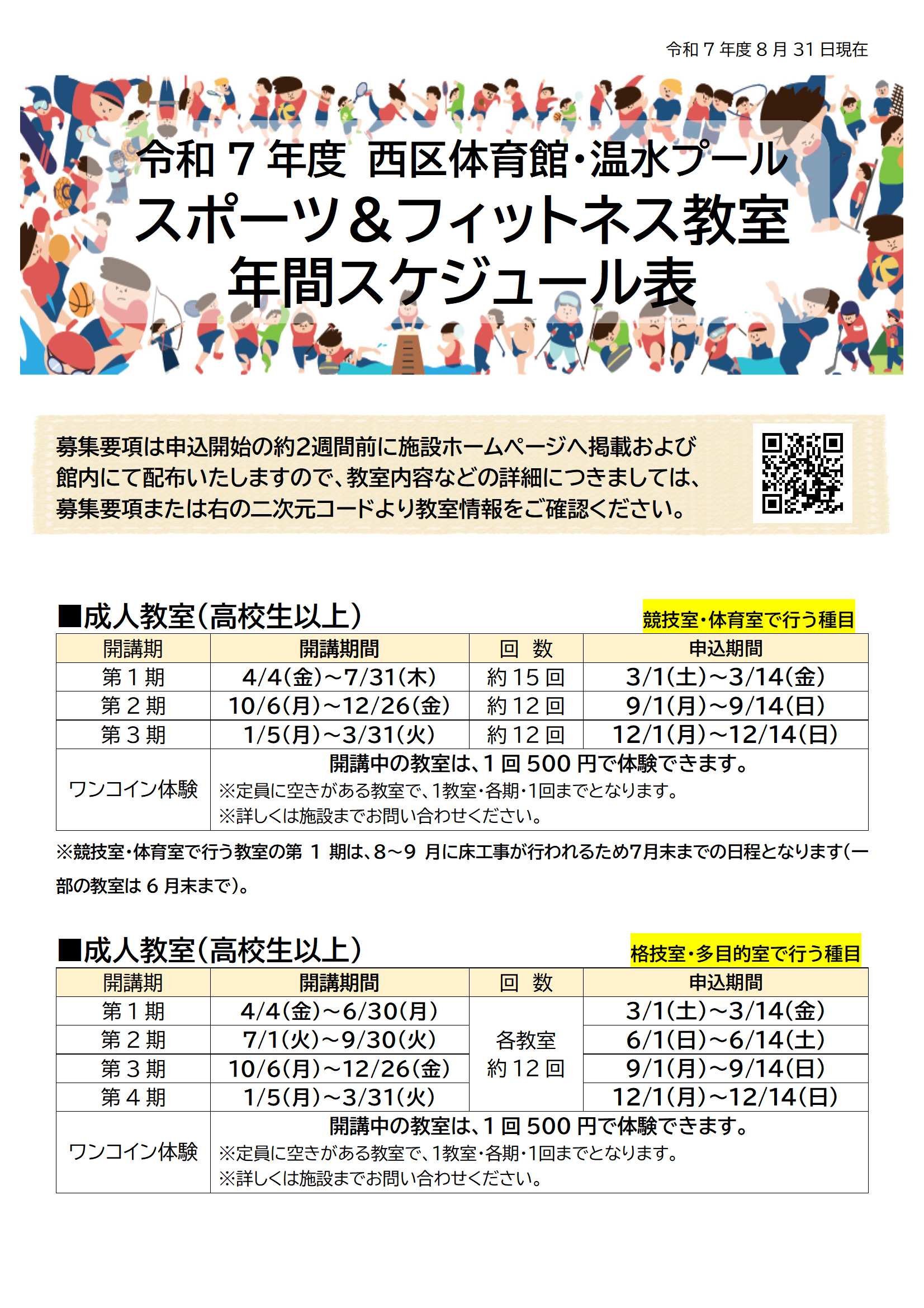 トピックス 令和7年度 スポーツ&フィットネス教室年間スケジュール表更新日:2025年2月1日各期の募集要項は申込期間開始の約2週間前に施設ホームページへ掲載および館内にて配布いたしますので、教室内容などの詳細につきましては、教室情報をご確認ください。▶︎ トピックス一覧に戻る