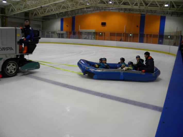 競技がすべて終わった後は、「ザンボニーラフティング」を行いました!整氷車に繋いだゴムボートに乗り込み、リンクを大きく回ります♪左右に振られ、皆さん楽しそうな様子でした!