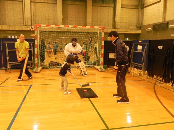 アイスホッケーシュート体験の様子 普段やったことがない競技にチャレンジすることが出来ます。