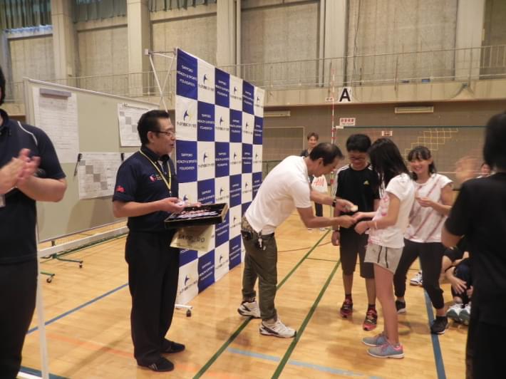 小学生ソフトバレーボール大会の表彰式 手稲区のマスコット、ていぬくんの缶バッジが贈呈されました。