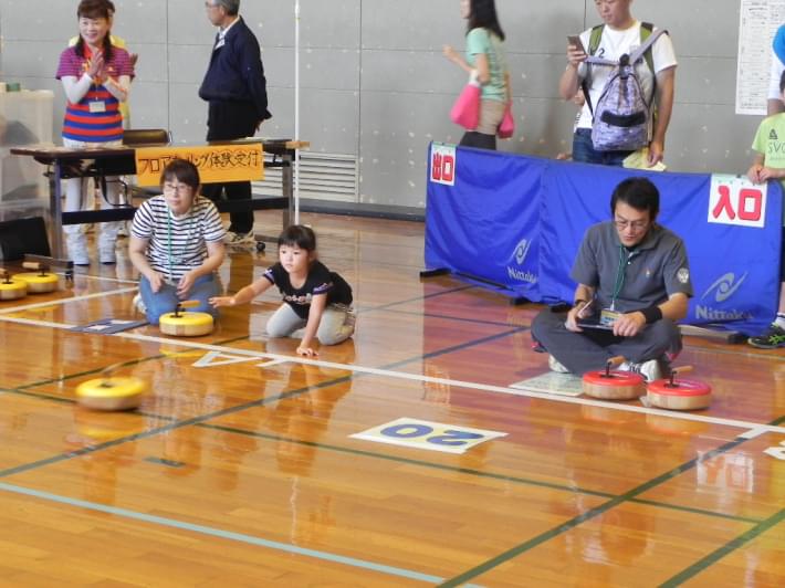 フロアカーリングの様子 最高得点を目指し、ストーンを投げます。