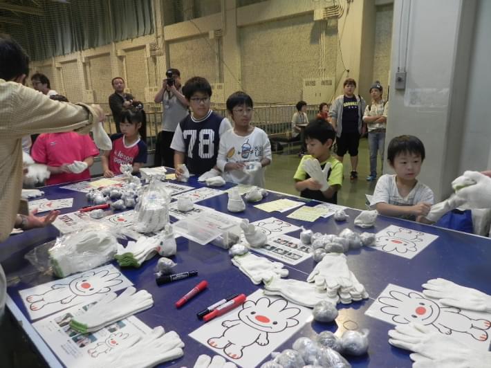 ていぬペタンクの様子 軍手で作ったていぬくんを用いて遊ぶことができます。