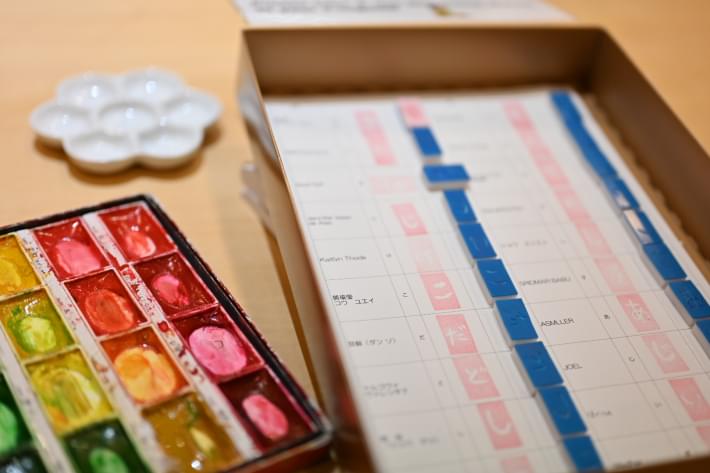 絵手紙で使用する顔彩と消しゴム判子です。判子は施設スタッフの力作で参加者への「おもてなし」です。