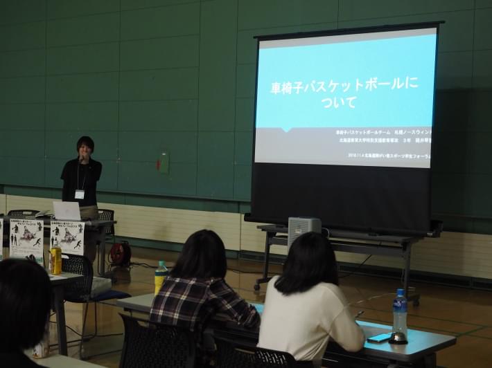 実践・研究報告では実際に当事者として車いすバスケをプレーする学生から、取り巻く環境で感じていることを発表しました。