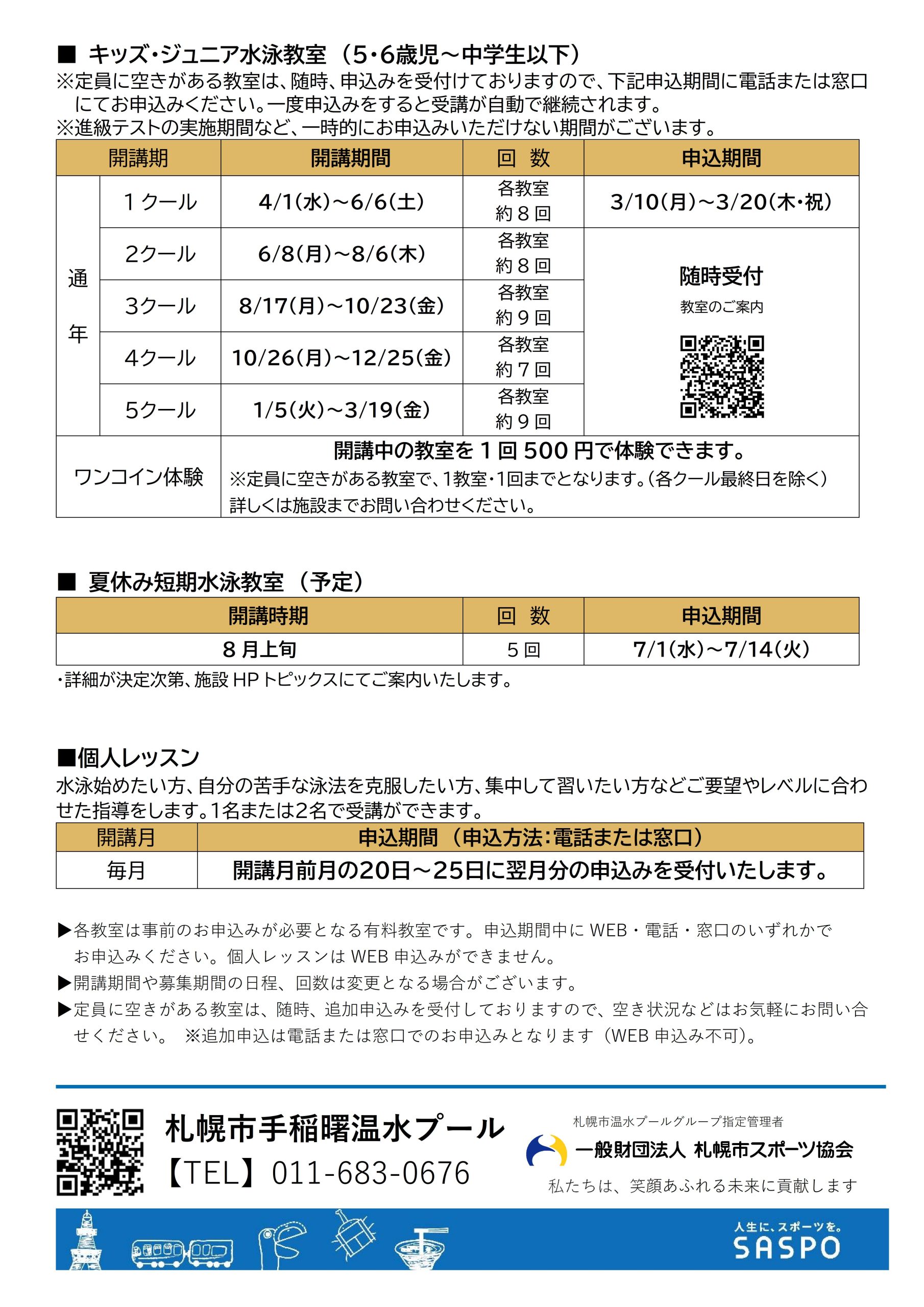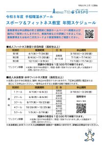 トピックス 令和8年度 スポーツ&フィットネス教室年間スケジュール表更新日:2026年2月1日各期の募集要項は申込開始の約2週間前に施設ホームページへ掲載および館内にて配布いたしますので、教室内容などの詳細につきましては、教室情報をご確認ください。 PDFファイル▶︎ トピックス一覧に戻る
