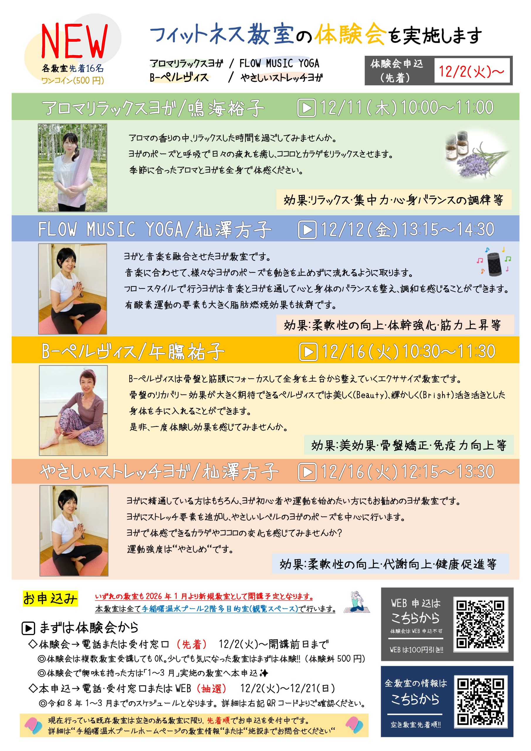 令和8年1月より新規フィットネス教室を4教室増設いたします。