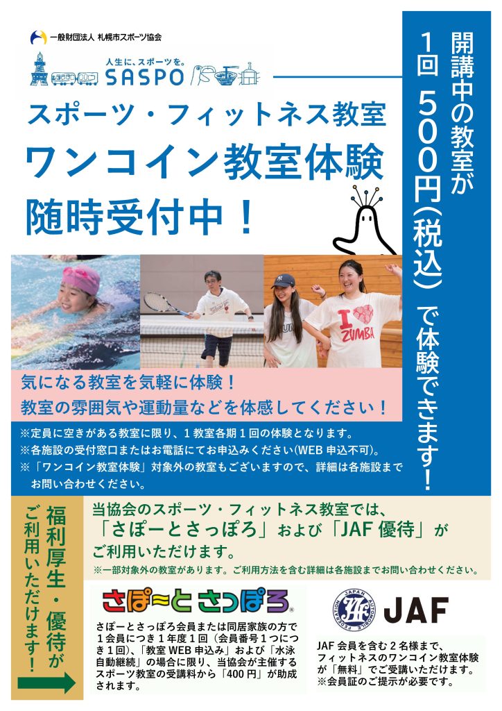 【教室】スポーツ・フィットネス教室「ワンコイン教室体験」随時受付中!