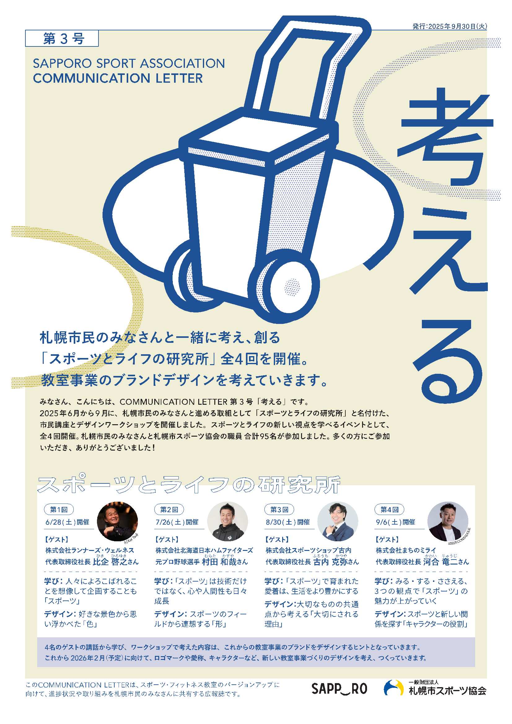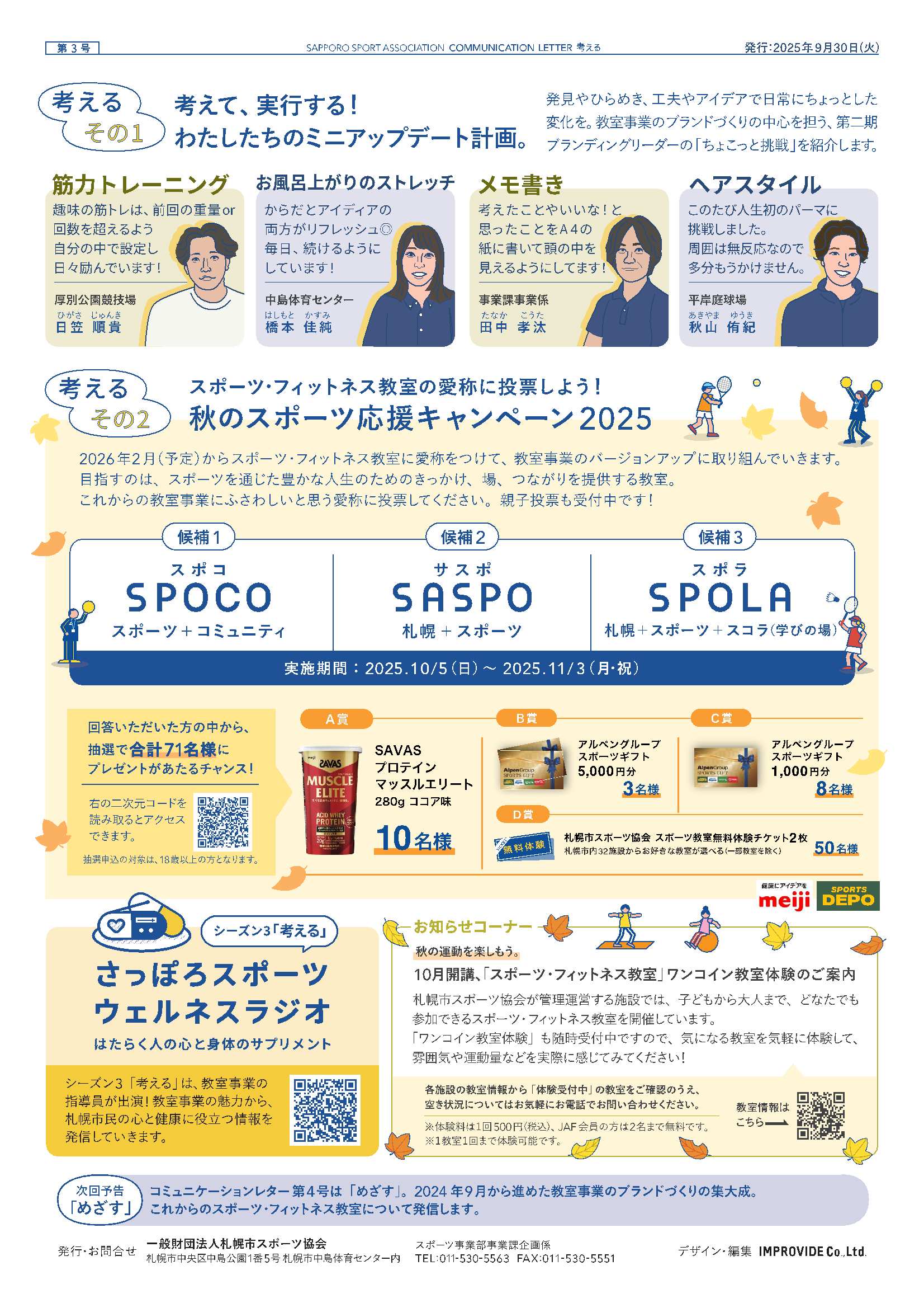 スポーツ・フィットネス教室のバージョンアップに向けて、進捗状況や取り組みを札幌市民のみなさまに、コミュニケーションレター(広報誌)や音声コンテンツを通じて発信させていただきます。