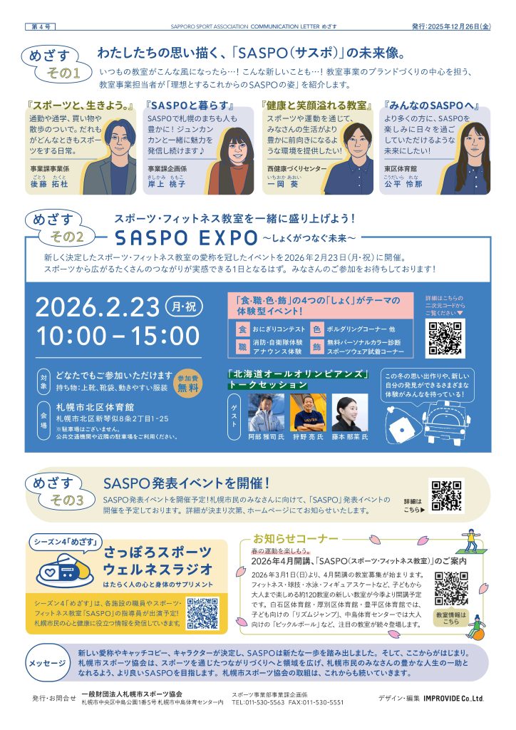 ▶新しい愛称やキャッチコピー、キャラクターが決定し、SASPOは新たな一歩を踏み出しました。そして、ここからがはじまり。札幌市スポーツ協会は、スポーツを通じたつながりづくりへと領域を広げ、札幌市民のみなさんの豊かな人生の一助となれるよう、より良いSASPOを目指します。
