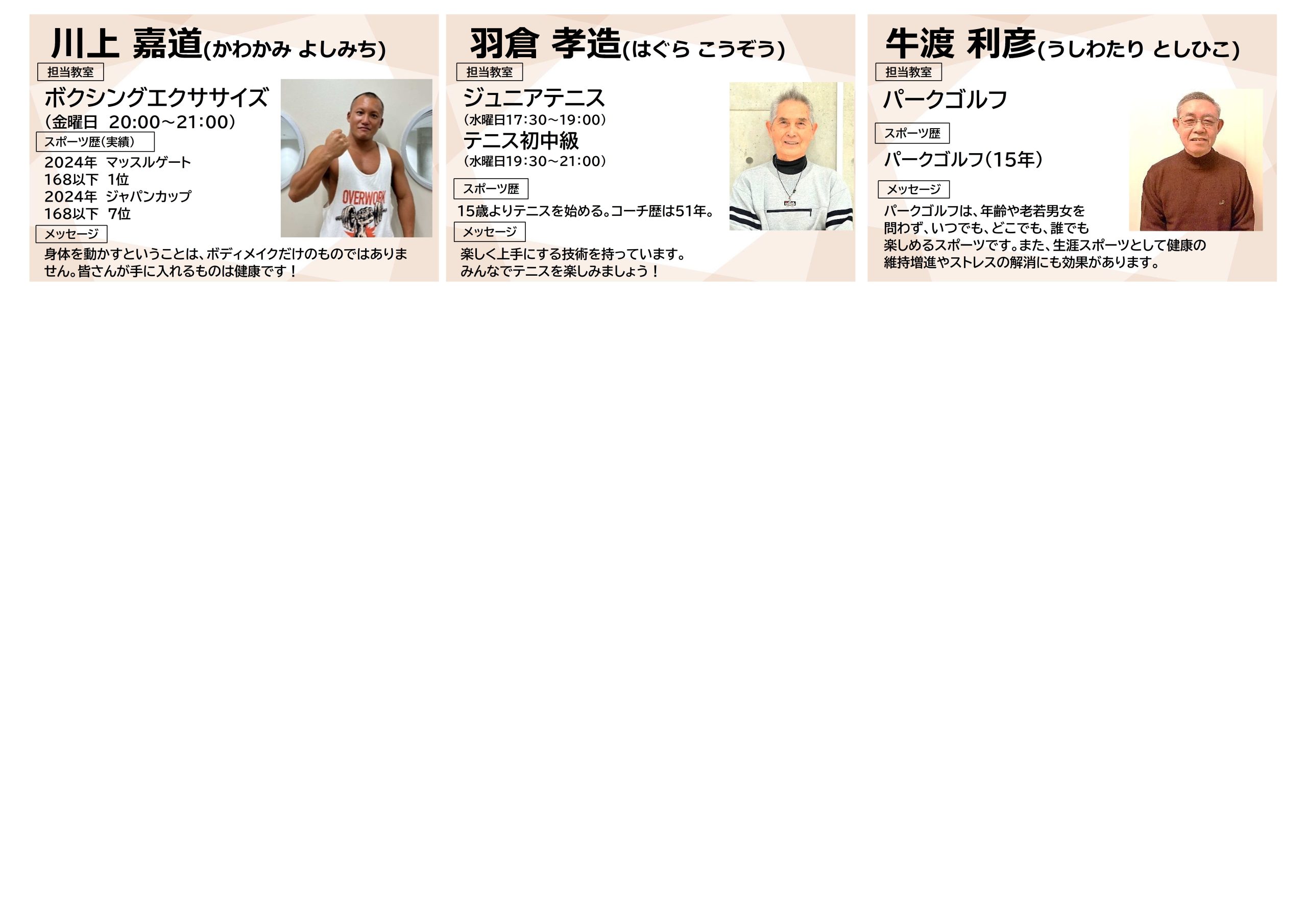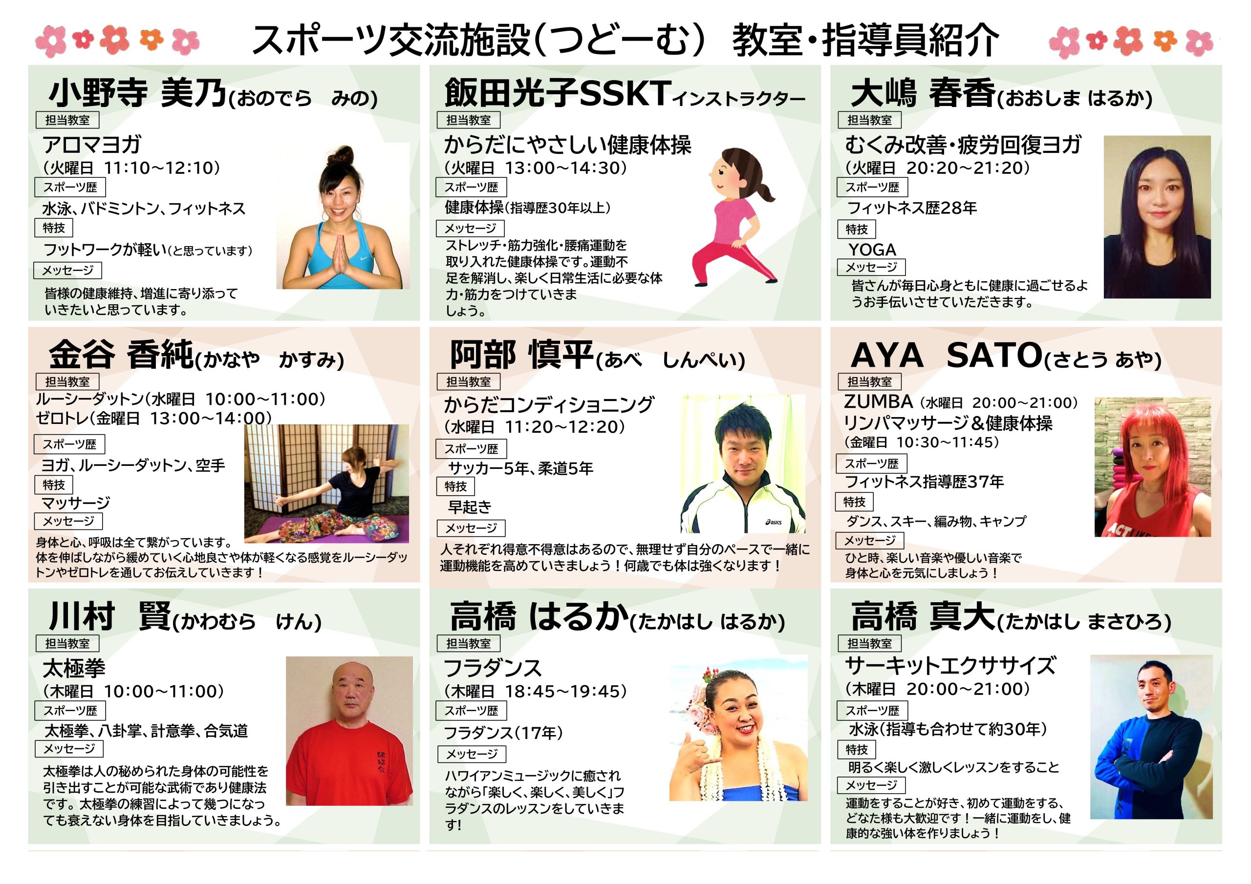 トピックス 令和7年度 教室・指導員紹介更新日:2025年2月13日教室の指導員をご紹介いたします!教室内容などの詳細につきましては、下記教室情報をご確認ください。 つどーむ 教室情報PDFファイル▶︎ トピックス一覧に戻る
