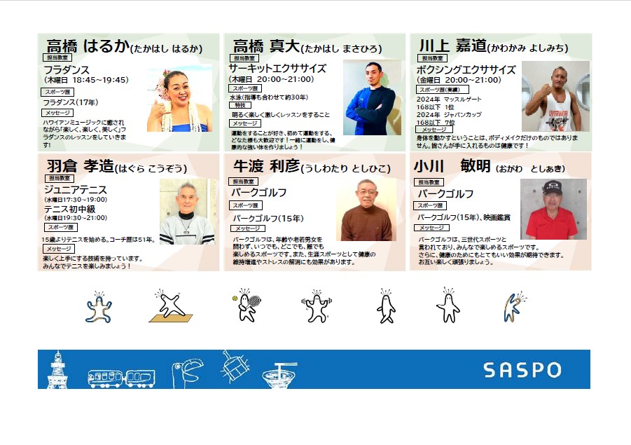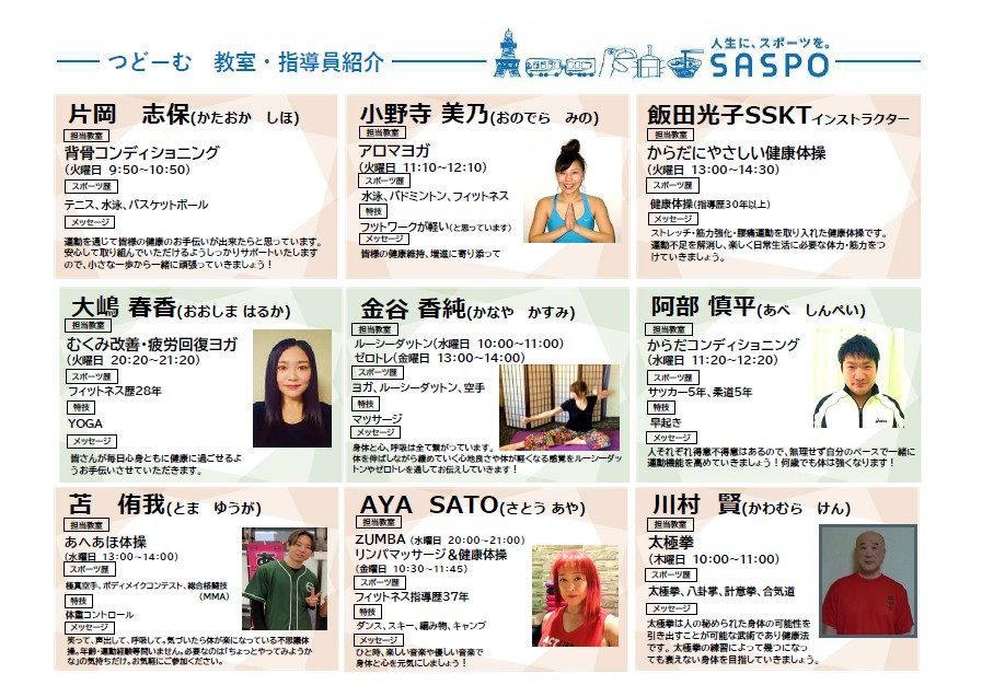 トピックス 令和8年度 教室・指導員紹介更新日:2026年2月1日教室の指導員をご紹介いたします!教室内容などの詳細につきましては、下記教室情報をご確認ください。 つどーむ 教室情報 ▶︎ トピックス一覧に戻る